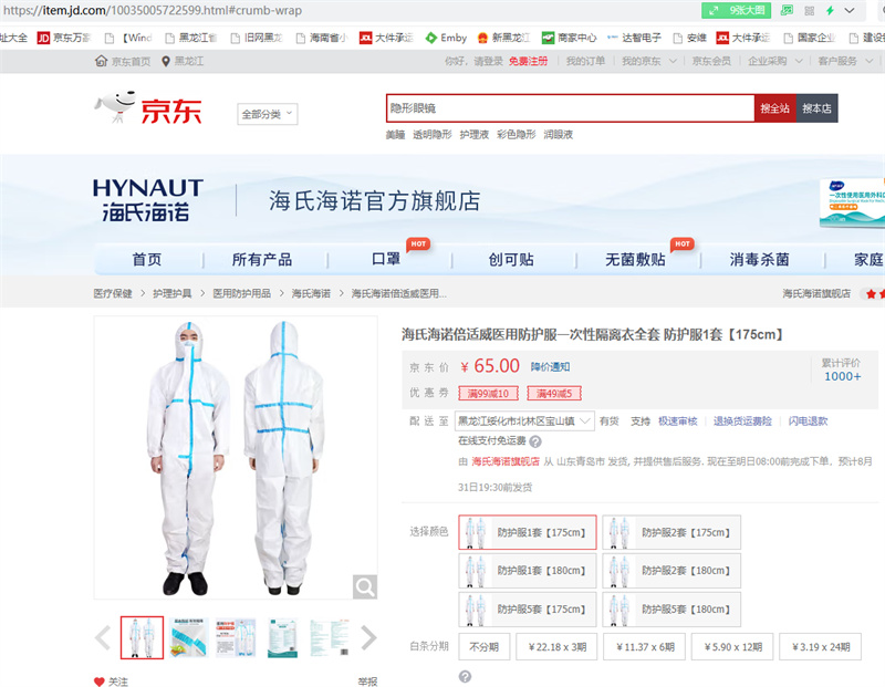 | 产品型号 | 海氏海诺 医用防护服 一次性隔离衣1套【175cm】 |