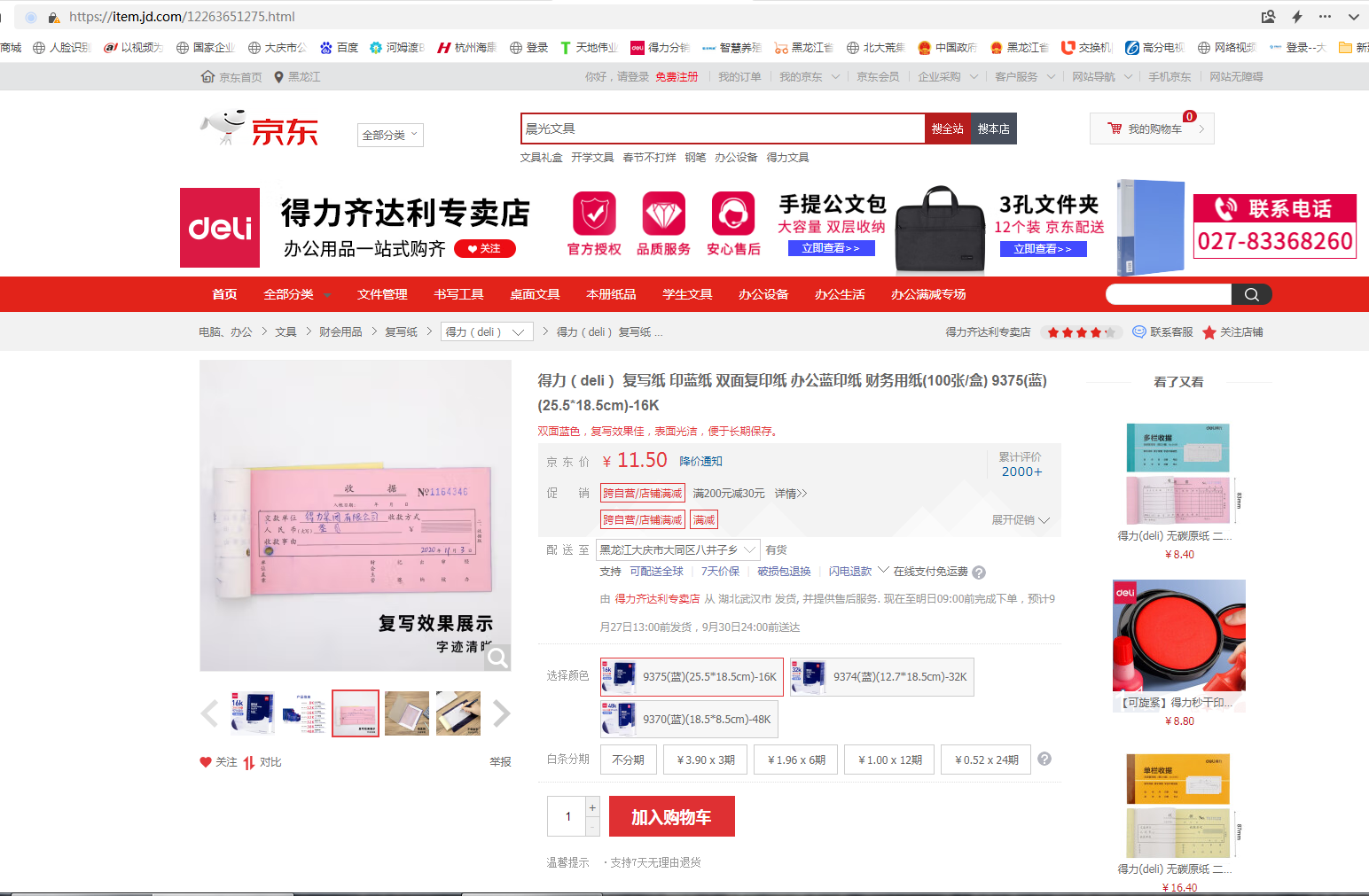 商品名称:得力(deli) 复写纸 印蓝纸 双面复印纸 办公蓝印纸 财务用纸(100张/盒) 9375(蓝)(25.5*18.5cm)-16K